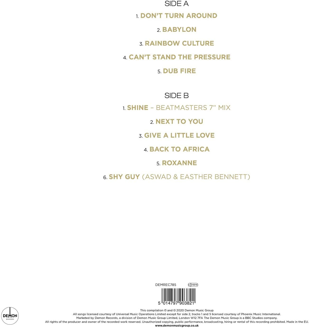 Arguably Britain's most successful reggae band, Aswad have been performing together since the mid 1970s and have released over 20 albums. This new compilation includes tracks from across the group's career including their early roots reggae recordings to their later pop-reggae fusion hits. All 3 of Aswad's top 20 hits are included: the UK #1 single 'don't turn around' Which topped the charts 1988, the follow up single 'give a little love', and 1994's 'shine' Which peaked at #5. Other highlights include some of the group's classic roots reggae tracks such as 'can't stand the pressure' And 'back to Africa' Plus a cover of the police's 'roxanne' And Aswad's collaboration with East her Bennett of eternal 'shy guy'. 11 of Aswad's best loved tracks on 140g, housed in a printed inner sleeve. Also available as a comprehensive 3CD set featuring 40 tracks.